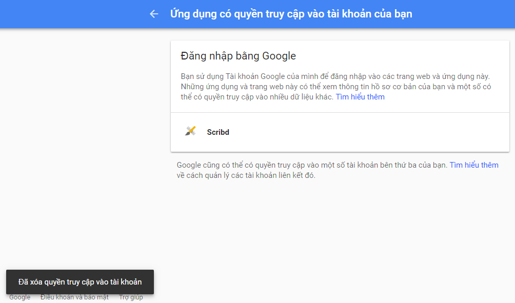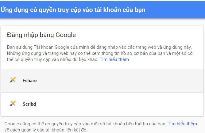 Mục này cho phép người dùng 'lần theo dấu vết' các ứng dụng hoặc dịch vụ được cấp phép truy cập vào các tài khoản của mình. Người dùng có thể xóa bỏ bất cứ ứng dụng hoặc dịch vụ nào cảm thấy không còn tin cậy.